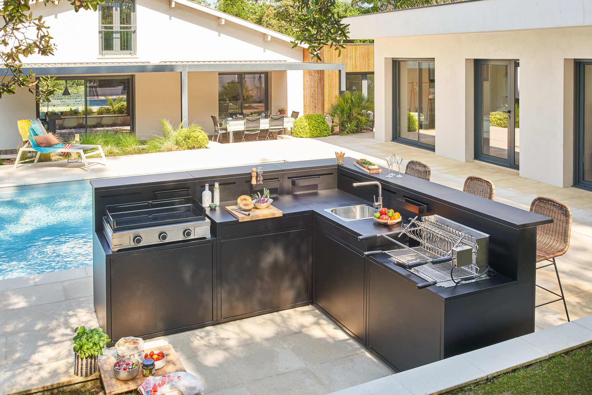 Onze meubels voor de buitenkeuken weerspiegelen de expertise, het design en het DNA van Forge Adour. Gezelligheid op zijn best! Beste levensgenieters, creëer en stel uw buitenkeuken samen, waar u al uw gasten kunt verwelkomen rondom de bar voor gezellige momenten en ongelooflijke feesten.
