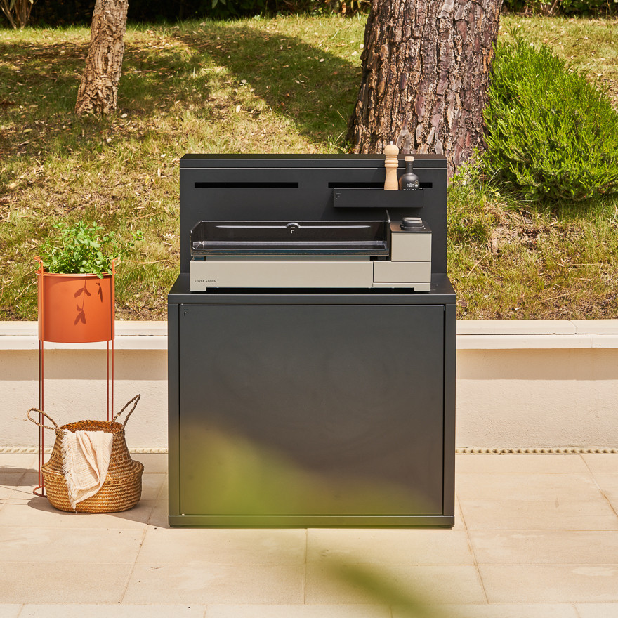 Het gesloten meubel van staal voor plancha biedt ideale opbergruimte voor de gasfles met een 'push to open'-deur, een barblad en een tafelblad voor alle bakplaten van maat 45, 60 en 75. Geleverd met een opbergbakje om uw kruiden, specerijen en keukengerei bij de hand te hebben tijdens het bakken.