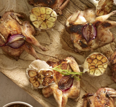 Crapaudine Wachtel, rote Grelotzwiebel und verbrannter Knoblauch